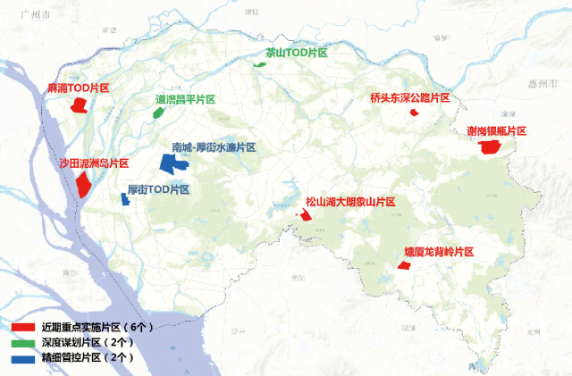 其中包括沙田泥洲岛片区、麻涌tod片区、松山湖大朗象山片区、谢岗银瓶片区共4个2000亩级别片区,以及塘厦龙背岭片区、桥头东深公路片区共2个700亩级别片区。